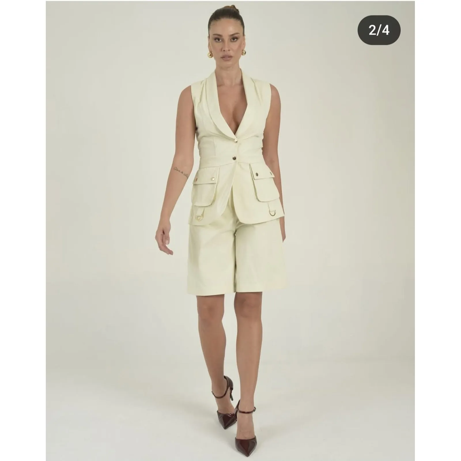 BERMUDA CARGO NO TECIDO SARJA, COM ELÁSTICO NA CINTURA NA PARTE POSTERIOR, BOLSOS NA FRENTE, COMPRIMENTO NOS JOELHOS, CINTURA ALTA
