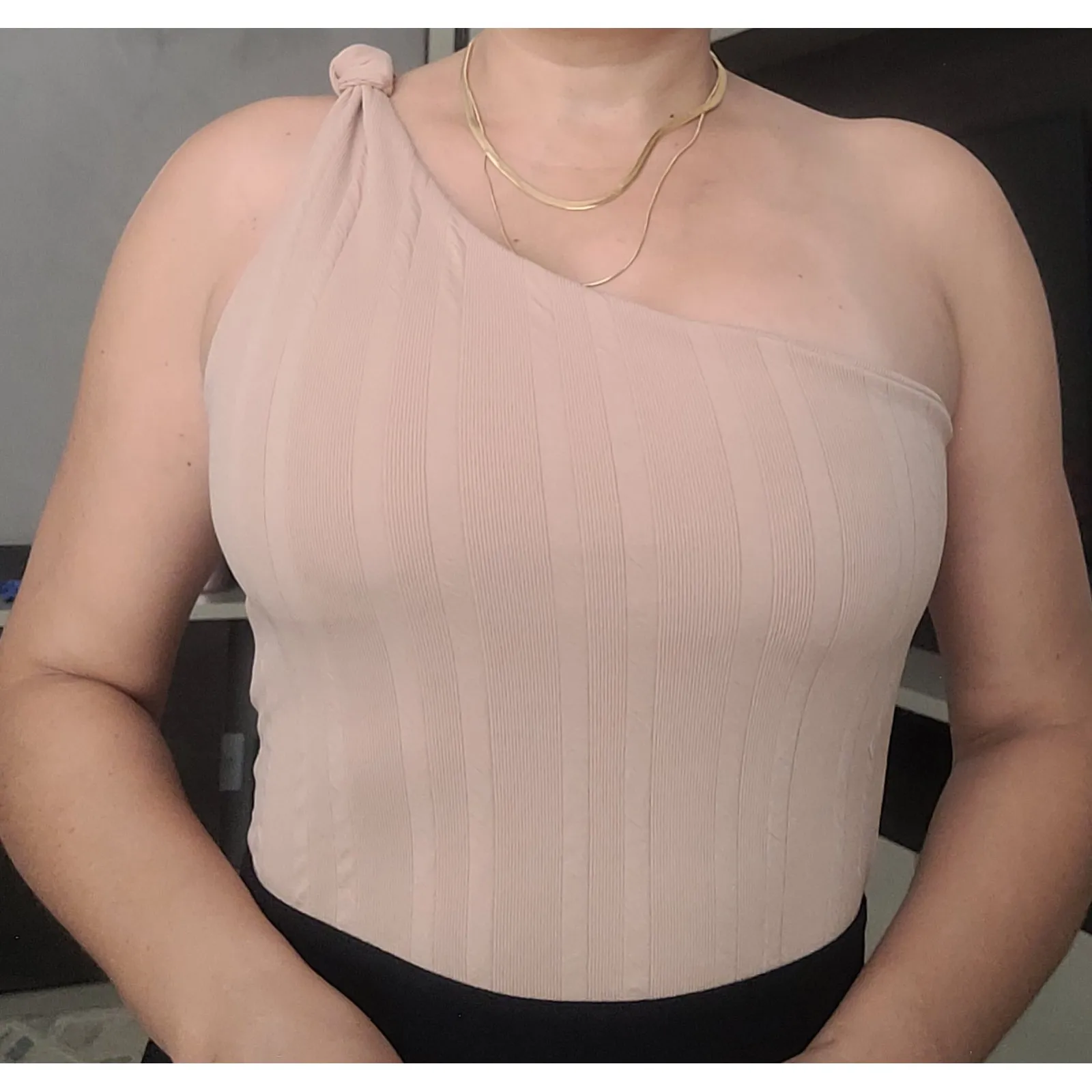 Este body de um ombro só é o toque perfeito de modernidade e elegância para o seu guarda-roupa. Com um detalhe de nó no ombro que confere um charme sofisticado, ele é feito em tecido de poliamida com elastano, garantindo conforto e um ajuste perfeito ao corpo.