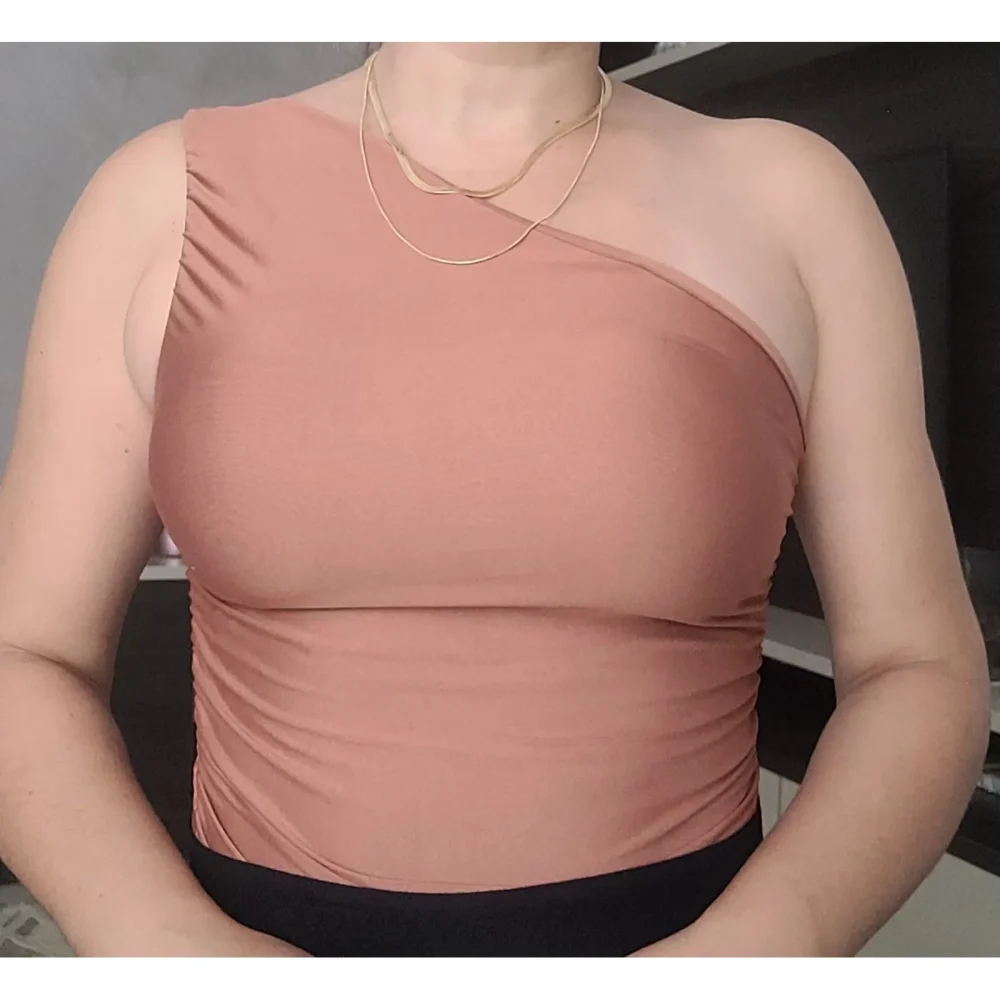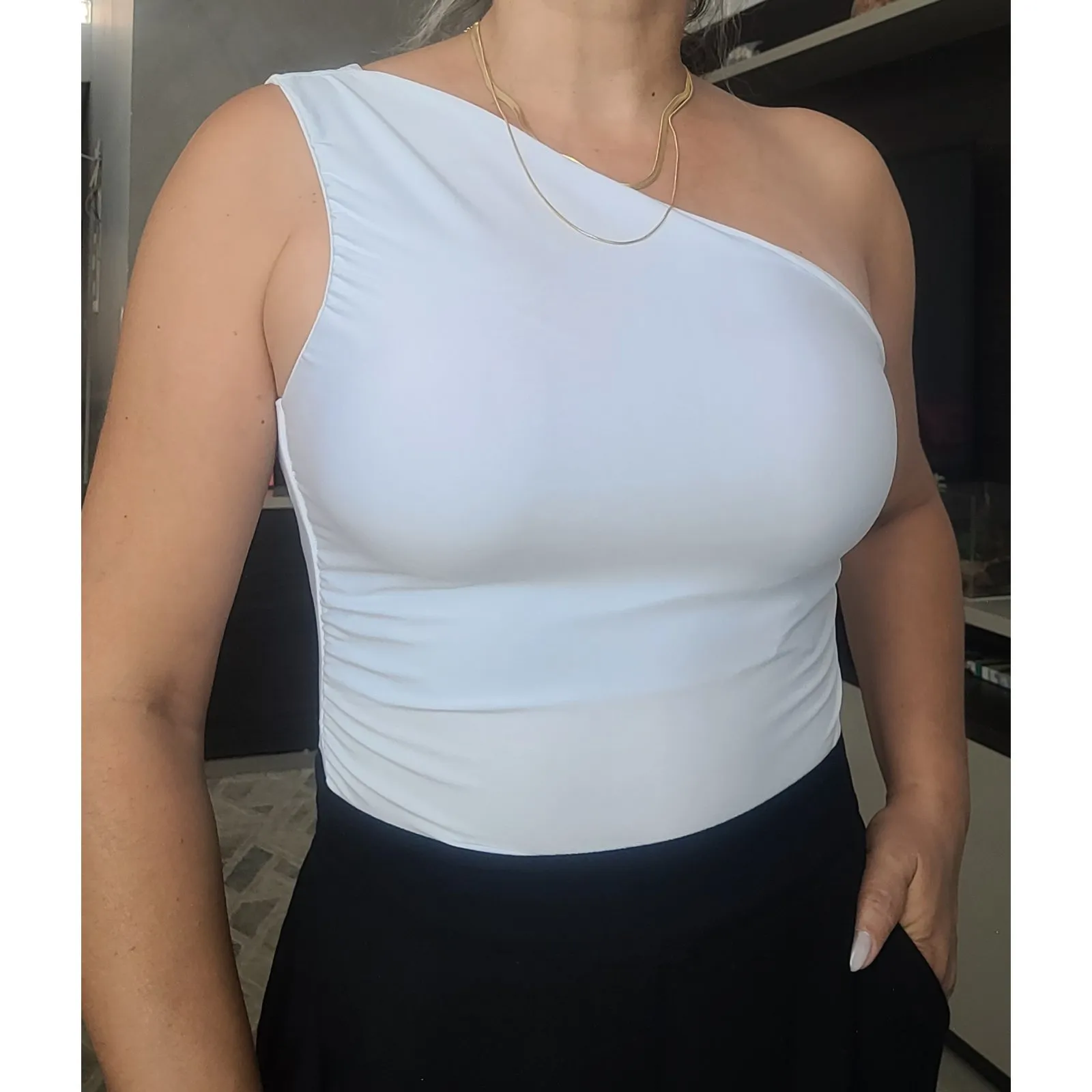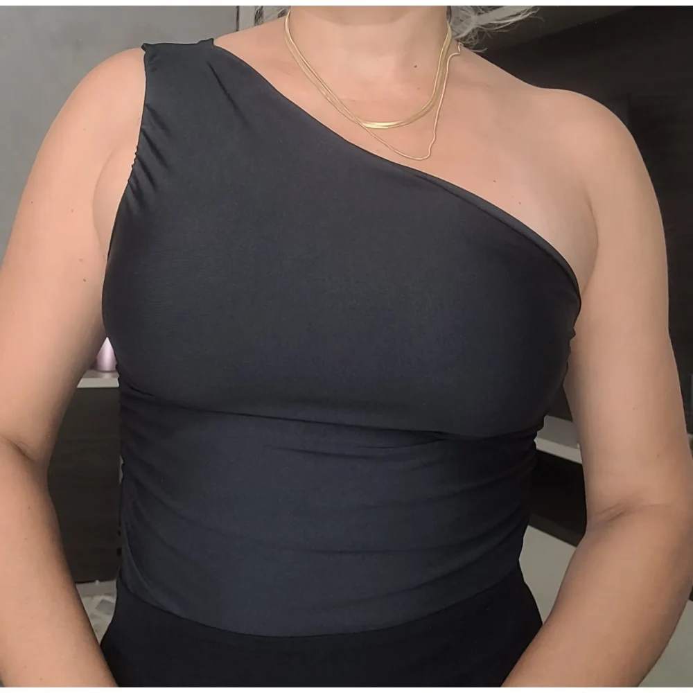 Body ombro único em tecido de poliamida e elastano. Com bojo embutido e fecho inferior com regulador. Detalhe drapeadona lateral, dando um charme ainda mais para essa peça . Tamanho único ( 38 ao 42)
