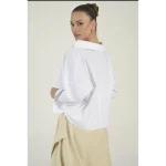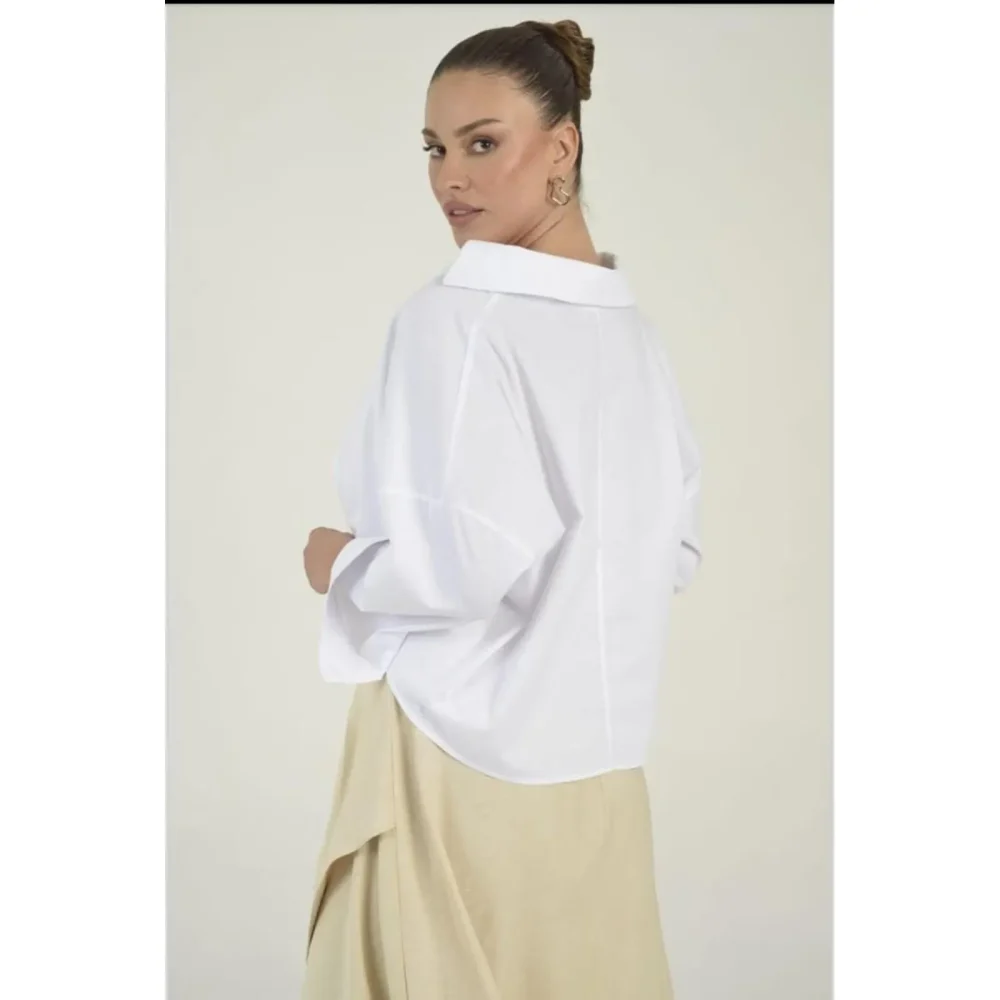 CAMISA EM TRICOLINE, TORCIDA NA FRENTE, COM BOTÕES FORRADOS, MANGA 3/4