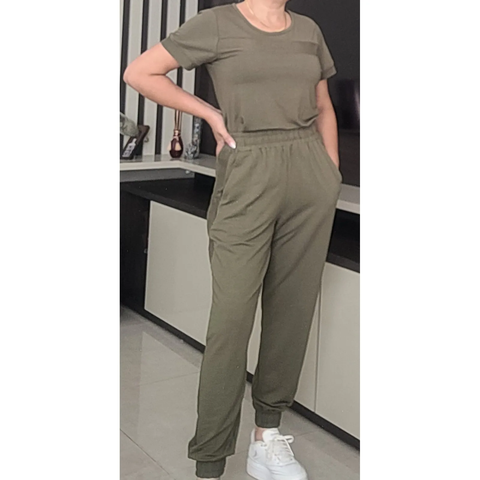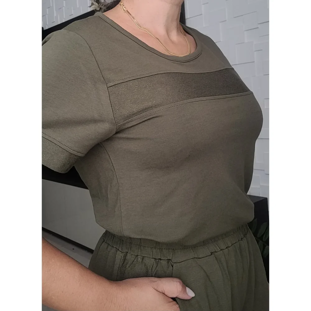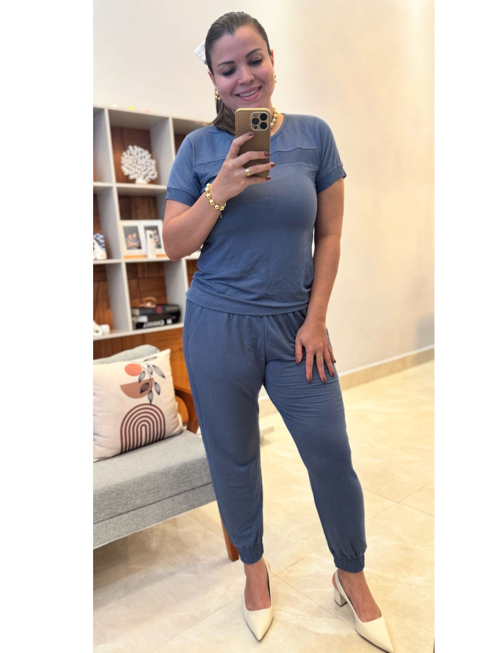 Conjunto em moletinho de alta gramatura, blusa manga curta, calça com bolsos na frente e elástico na barra