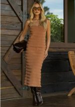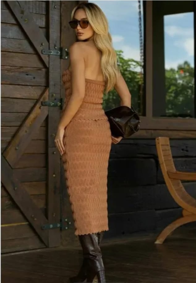 CONFECCIONADO EM TRICOT DE ALTA GRAMATURA COM ELASTANO. COMPOSTO POR SAIA MIDI E TOP TOMARA QUE CAIA