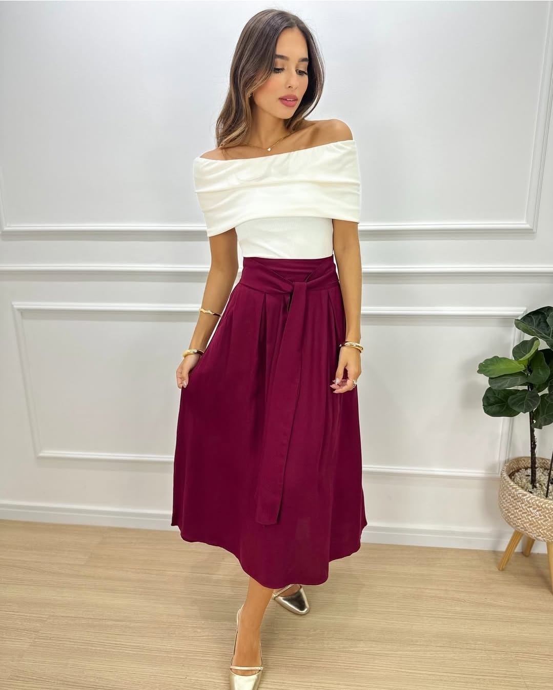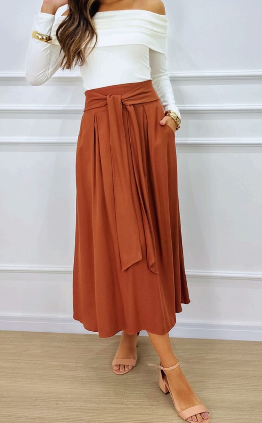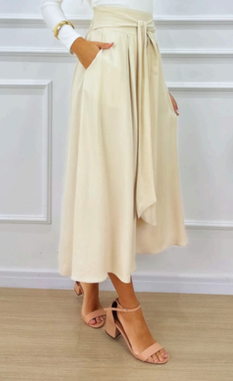 SAIA RODADA MIDI TECIDO VISCOSE LEVE E FLUÍDO, COM BOLSOS NA FRENTE E ELÁSTICO NA PARTE DE TRÁS DA CINTURA, COM AMARRAÇÃO NA FRENTE