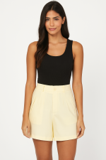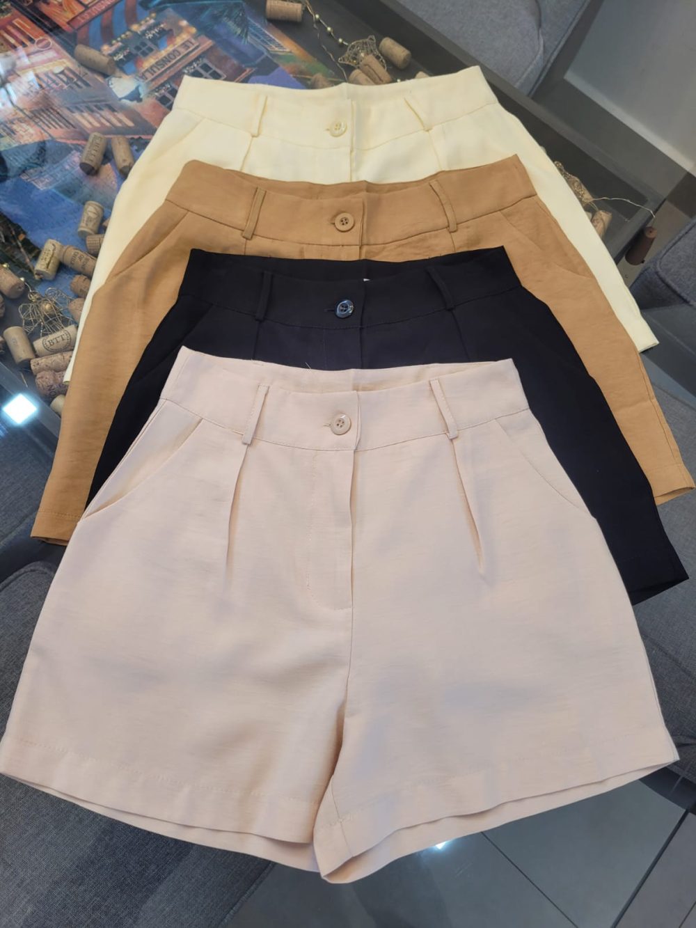 Esses shorts de alfaiataria possuem modelagem moderna, cintura alta e pregas frontais que trazem elegância ao visual. Com fechamento em botão e zíper, além de bolsos estilo faca laterais e funcionais, são perfeitos para composições que vão do casual ao sofisticado.