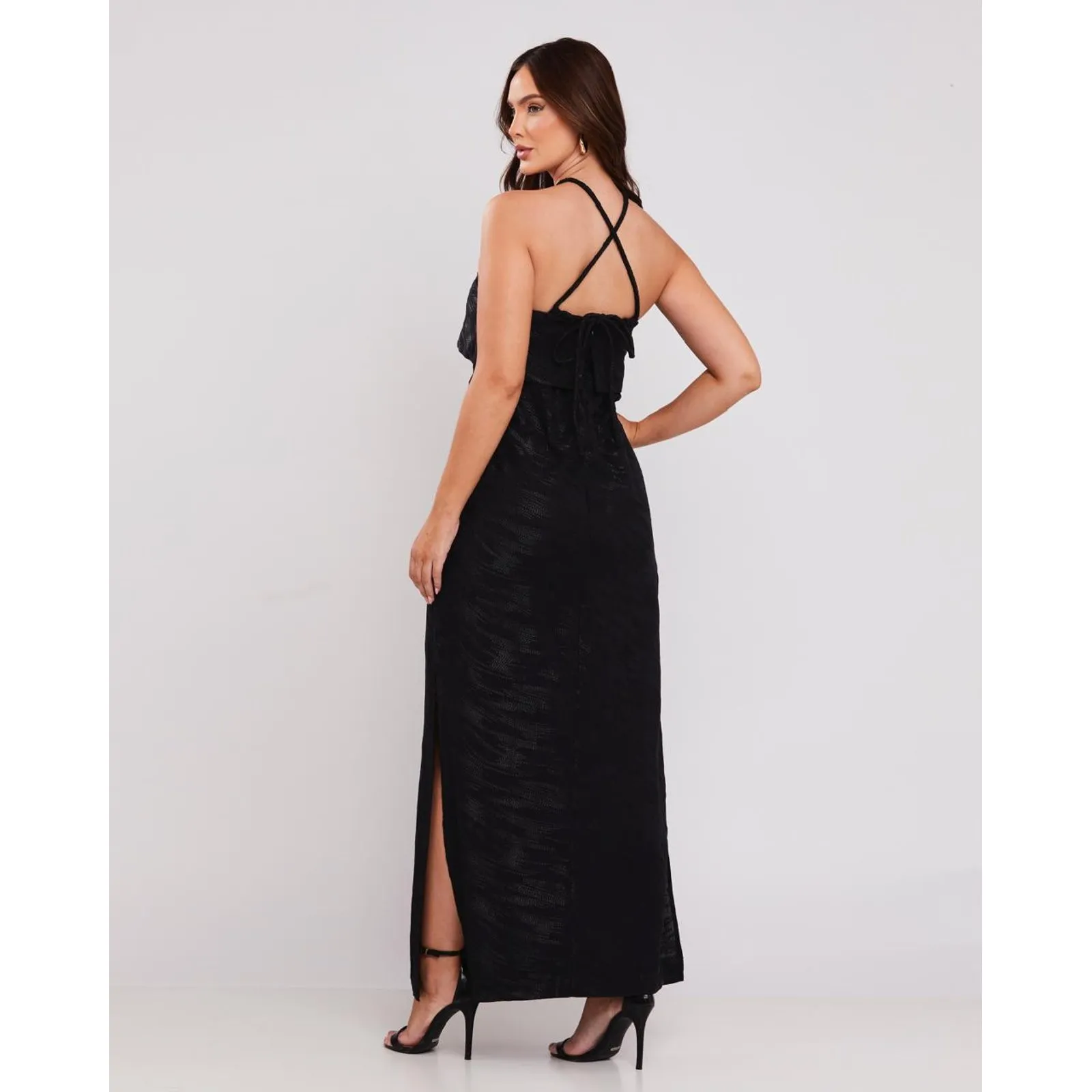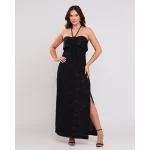 VESTIDO LONGO PRETO, COM DUAS FENDAS LATERAIS, POLIESTER COM VISCOSE E PESPONTO, CORDÃO COM AMARRAÇÃO NAS COSTAS, ZÍPER INVISÍVEL NA PARTE DE TRÁS.